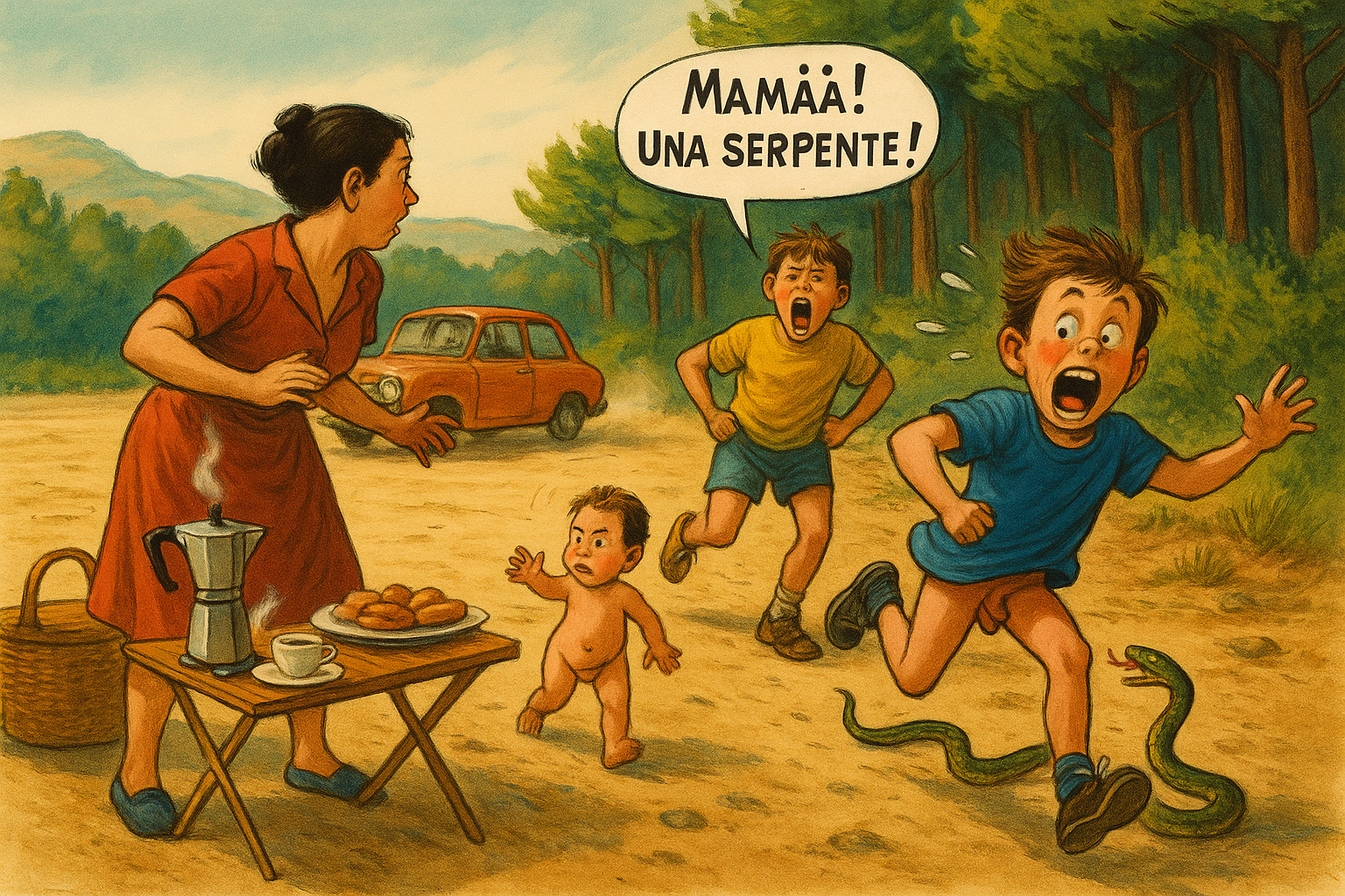 Tijdens een vakantie in Spanje – Ocaña, jaren ’70/’80, met moeder, vader en twee broers. Op een zandige parking zette mama haar koffiepot op een vuurtje, zoals altijd met alles erop en eraan. Terwijl zij rustig koffie regelde, moest mijn broer dringend “naar het bos”. Ik rende mee, maar net toen hij bezig was, riep hij in paniek: “Mamaaaa, een slang!!” 🐍. Ik was sneller weg dan de slang zelf, lachend en half gillend, terwijl mama nog bij haar koffie bleef. Het tafereel werd een legendarische familieherinnering, vol humor, paniek en onvergetelijke waarheid.
