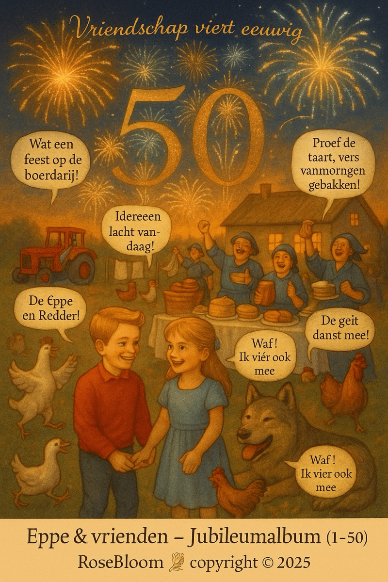 eppeenvrienden #jubileumalbum #strip50 #boerderijfeest #vriendschapviert #eppeenmarja #redderdewolf #goudblauwenacht #rosebloomwri #poëtischeboerderij #vuurwerkbovenhetveld #illustratiemetziel #dutchartist #storytellingfarm #rosebloomschrijft #zachtekrachtschrijftzichvrij #rosebloomart #friendshipforever #rosebloom🌹copyright©2025