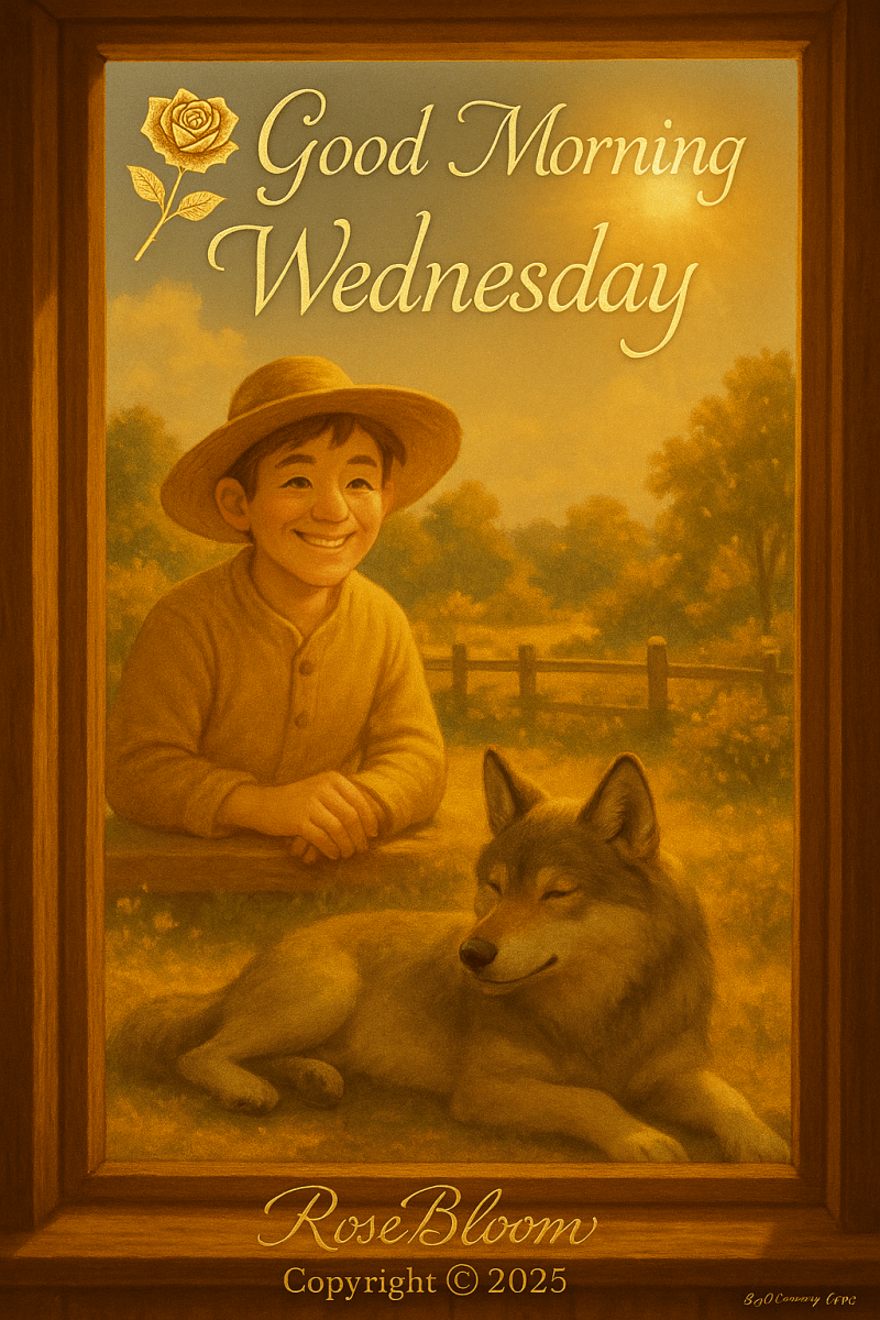 Morning Song for WednesdayThe sun spills gold upon the field,where silence blooms and hearts are healed.A boy, a wolf ā the dawn they share,in gentle trust, in open air.No rush, no race, just day begun,two souls at peace beneath the sun.