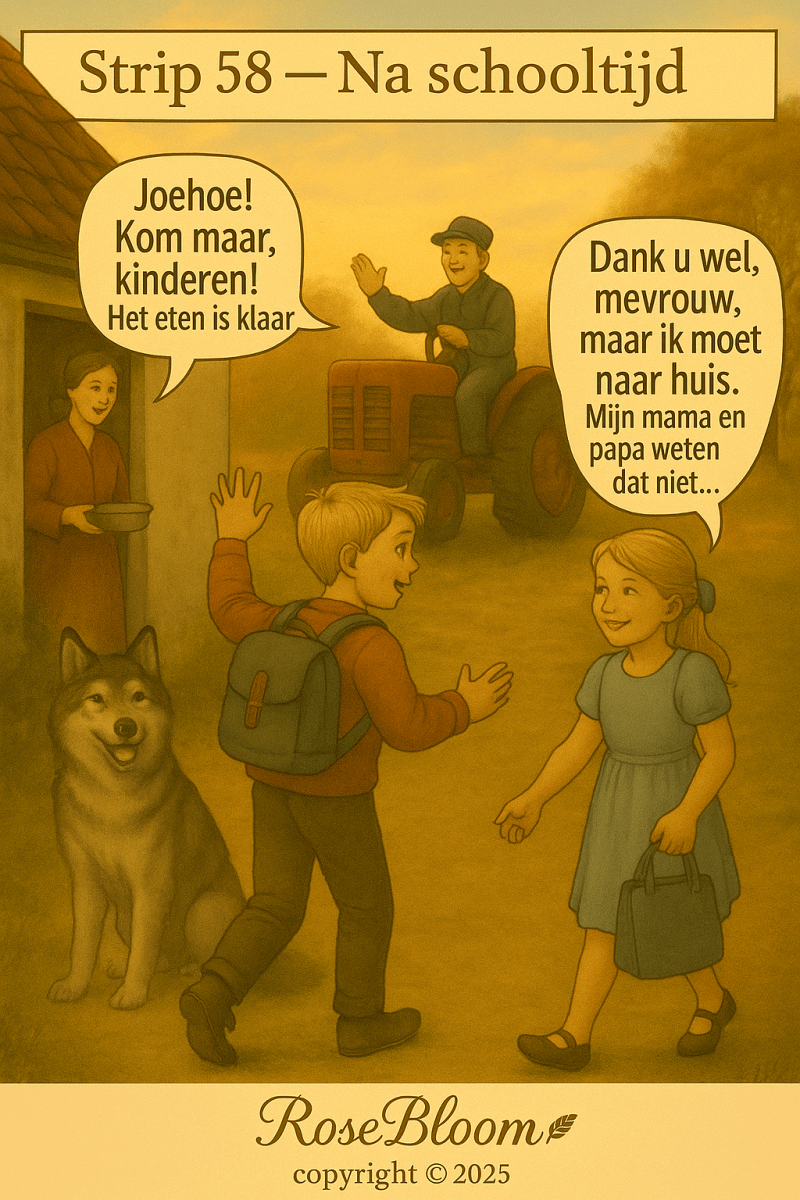 Marja stapte naast hem, met haar blauwe lint en haar schooltas stevig vast. Ze lachte voorzichtig; het was de stilte van het einde van een dag vol letters en cijfers.